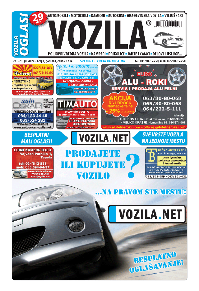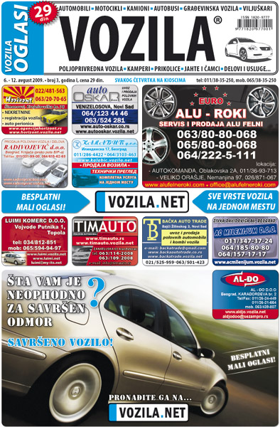 Pokrenuli smo časopis VOZILA OGLASI, koji se prodaje na teritoriji cele Srbije. Izlazi jednom nedeljno i što je najvažnije po ceni od 29 dinara je najjeftiniji specijalizovani časopis za vozila. U svakon novom broju možete pogledati veliki broj aktuelnih oglasa, koji se iz nedelje u nedelju ažuriraju. Ono što je najvažnije, možete potpuno BESPLATNO da postavite Vaš oglas na sajt www.vozila.net i da ga oznaćite da se štampa kao mali oglas u novom broju časopisa VOZILA OGLASI.